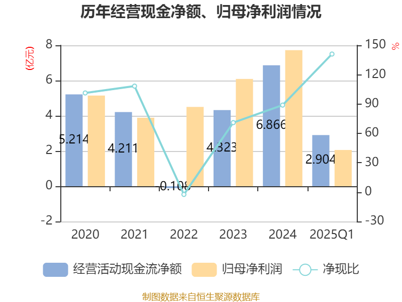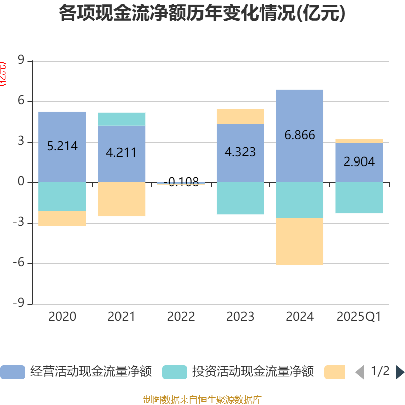 截至2025年一季度末配配查官网,公司经营活动现金流净额为2.9亿元,同比增长88.82%;筹资活动现金流净额2820.87万元,同比减少1848.85万元;投资活动现金流净额-2.29亿元,上年同期为-2.38亿元。